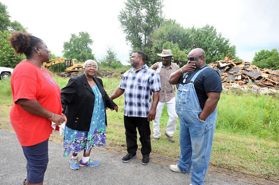 Displaced Pinhook residents came out yesterday to watch work begin on the demolition of the remaining structures in their destroyed town. Pinhook, which was devastated over four years ago by the operation of the Birds Point-New Madrid Floodway, has remained uninhabited. Residents are currently seeking to purchase land outside the Floodway so that they can rebuild their town away from the danger of another intentional levee breach.